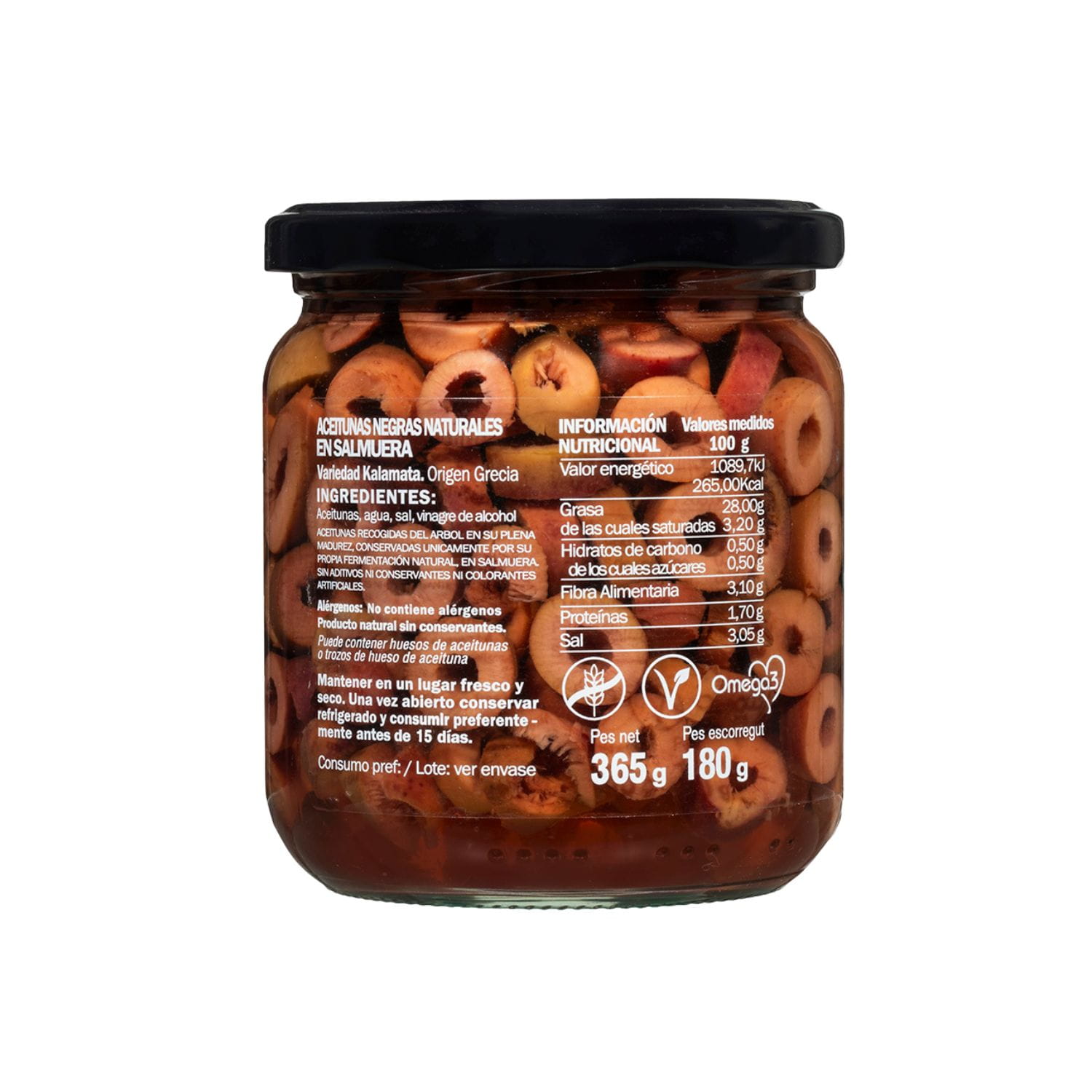 Oliwki Kalamata bez pestki, woda, sól, ocet spirytusowy, naturalne przyprawy.