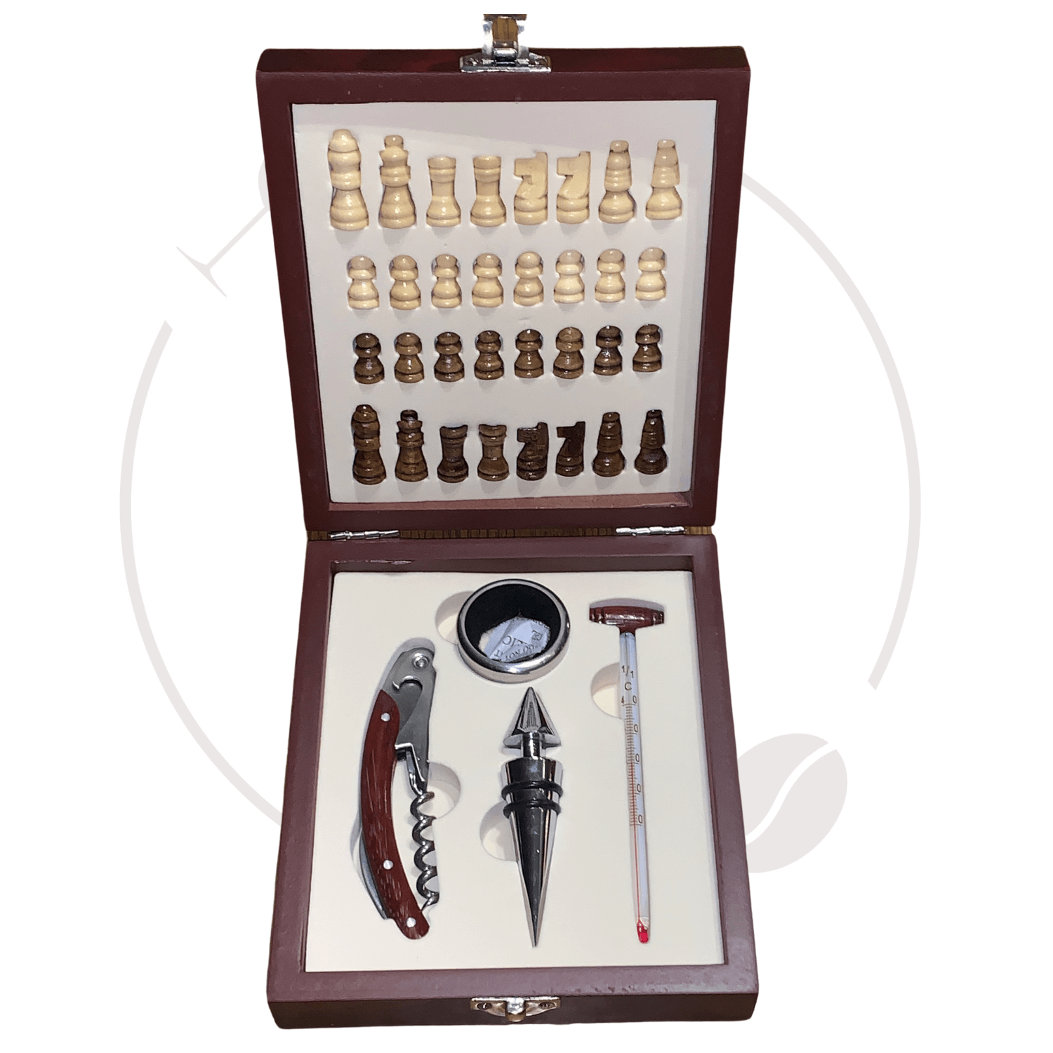 Zawiera 4 elementy: nóż kelnerski, termometr, zatyczkę oraz opaskę na szyjkę butelki. Zestaw posiada także komplet do gry w szachy, gdzie pudełko stanowi planszę do gry.